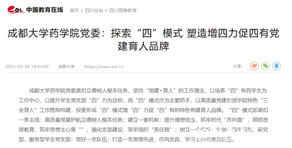 藥學院、川抗所堅定以高質量黨建引領賦能高質量發展,創新結合二級學科和藥物研發鏈優化黨支部,實現“雙帶頭人”全覆蓋和“一支部一品牌”。獲全市基層黨建工作項目,學校黨建引領示范學院、先進黨組織、樣板黨支部、“雙帶頭人”工作室等。形成了“五重塑”“五型五力”“紅-領-帶”“四模式增四力促四有”等工作法和黨建品牌,獲中國日報網、中國教育網報道;3人次獲市級優秀黨員等。