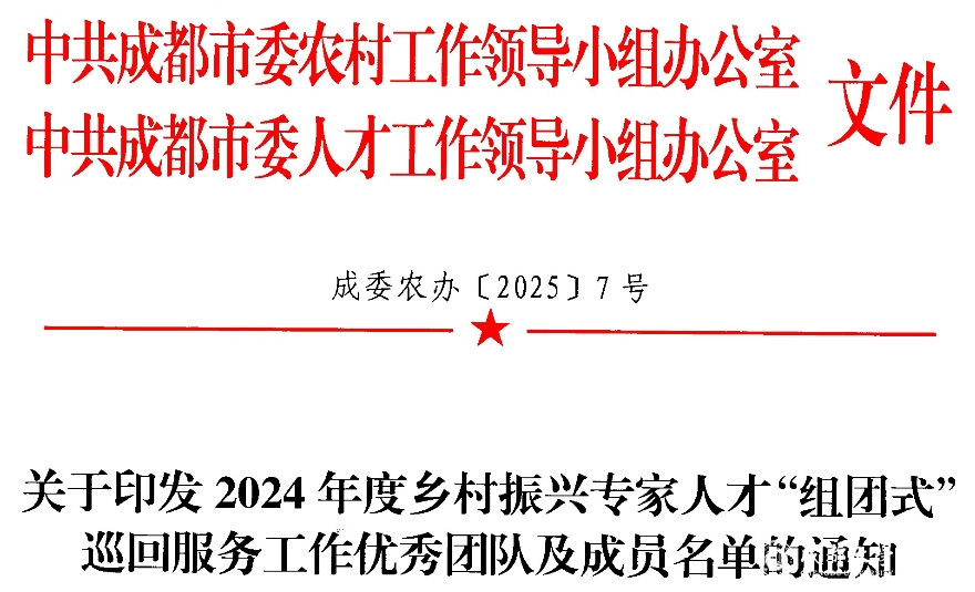 原文鏈接:http://www.cfoodw.com/n/41557.html 原文如下:在2025年中央一號(hào)文件發(fā)布的前夕,2月17日,中共成都市委農(nóng)村工作領(lǐng)導(dǎo)小組辦公室、中共成都市委人才工作領(lǐng)導(dǎo)小組辦公室聯(lián)合下發(fā)文件《關(guān)于印發(fā)2024年度鄉(xiāng)村振興專家人才“組團(tuán)式”巡回服務(wù)工作優(yōu)秀團(tuán)隊(duì)及成員名單的通知》(成委農(nóng)辦[2025]7號(hào));成都大學(xué)劉達(dá)玉教授(龍泉團(tuán))、王新惠教授(雙流團(tuán))帶領(lǐng)的農(nóng)業(yè)專家服務(wù)團(tuán),分別榮獲2024年度鄉(xiāng)村振興專家人才“組團(tuán)式巡...