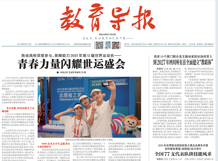 原文鏈接:https://jydb.scedumedia.com/DocumentElectronic/doc-29048.html原文如下:8月7日至17日,2025年第12屆世界運動會在四川成都成功舉辦。賽場上,運動員們揮灑激情汗水、綻放拼搏風采,書寫了“運動無限,氣象萬千”的精彩篇章。盛會背后,眾多四川高校主動擔當、深度參與,學生運動員每分必爭、為國爭光;“小青椒”志愿者以專業服務傳遞溫暖友善;還有高校發揮專業優勢,以高校智慧為賽事保駕護航。多點突破,四川高校學子表現亮眼...