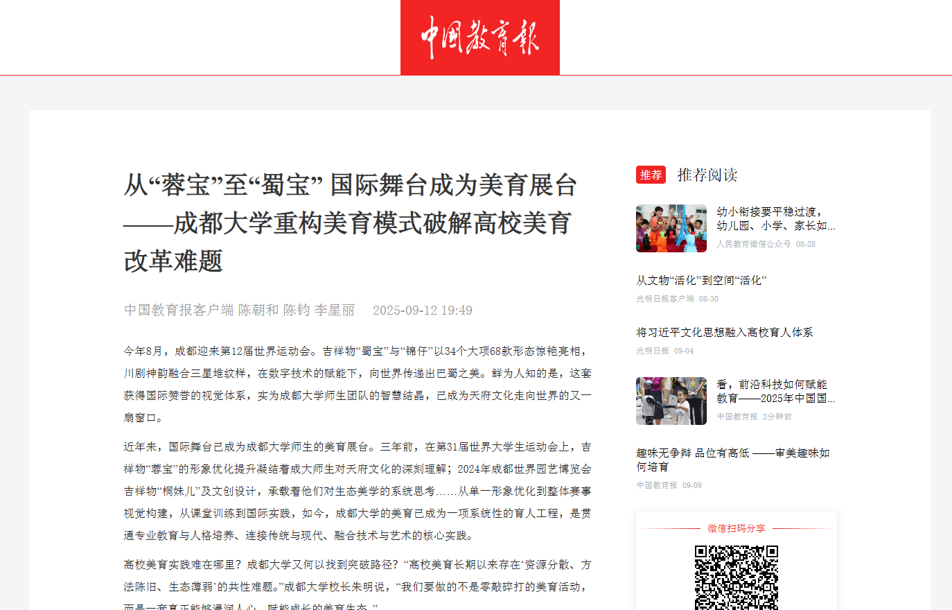 9月12日,《中國教育報》客戶端以《從“蓉寶”至“蜀寶”國際舞臺成為美育展臺——成都大學重構美育模式破解高校美育改革難題》為題報道我校以美育人、以文化人的系統實踐。原文如下:今年8月,成都迎來第12屆世界運動會。吉祥物“蜀寶”與“錦仔”以34個大項68款形態驚艷亮相,川劇神韻融合三星堆紋樣,在數字技術的賦能下,向世界傳遞出巴蜀之美。鮮為人知的是,這套獲得國際贊譽的視覺體系,實為成都大學師生團隊的智慧結晶,已成為天府文化走向世界的又一扇窗口。近年來,國際舞臺已成為成都大學師生的美...