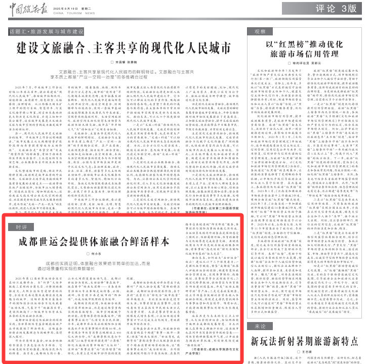 2025年8月19日刊出的《中國旅游報》第3版評論版,刊發我校旅游與文化產業學院教師何小東撰寫的時評文章《成都世運會提供體旅融合鮮活樣本》。原文鏈接:https://www.ctnews.com.cn/paper/content/202508/19/content_105080.html原文如下:成都的實踐證明,體旅融合效果絕非簡單的加法,而是通過場景重構實現的乘數增長。2025年第12屆世界運動會近日在四川成都舉辦。當“竹夢”火炬串聯起三星堆的古蜀光芒、興隆湖的粼粼波光,點燃...