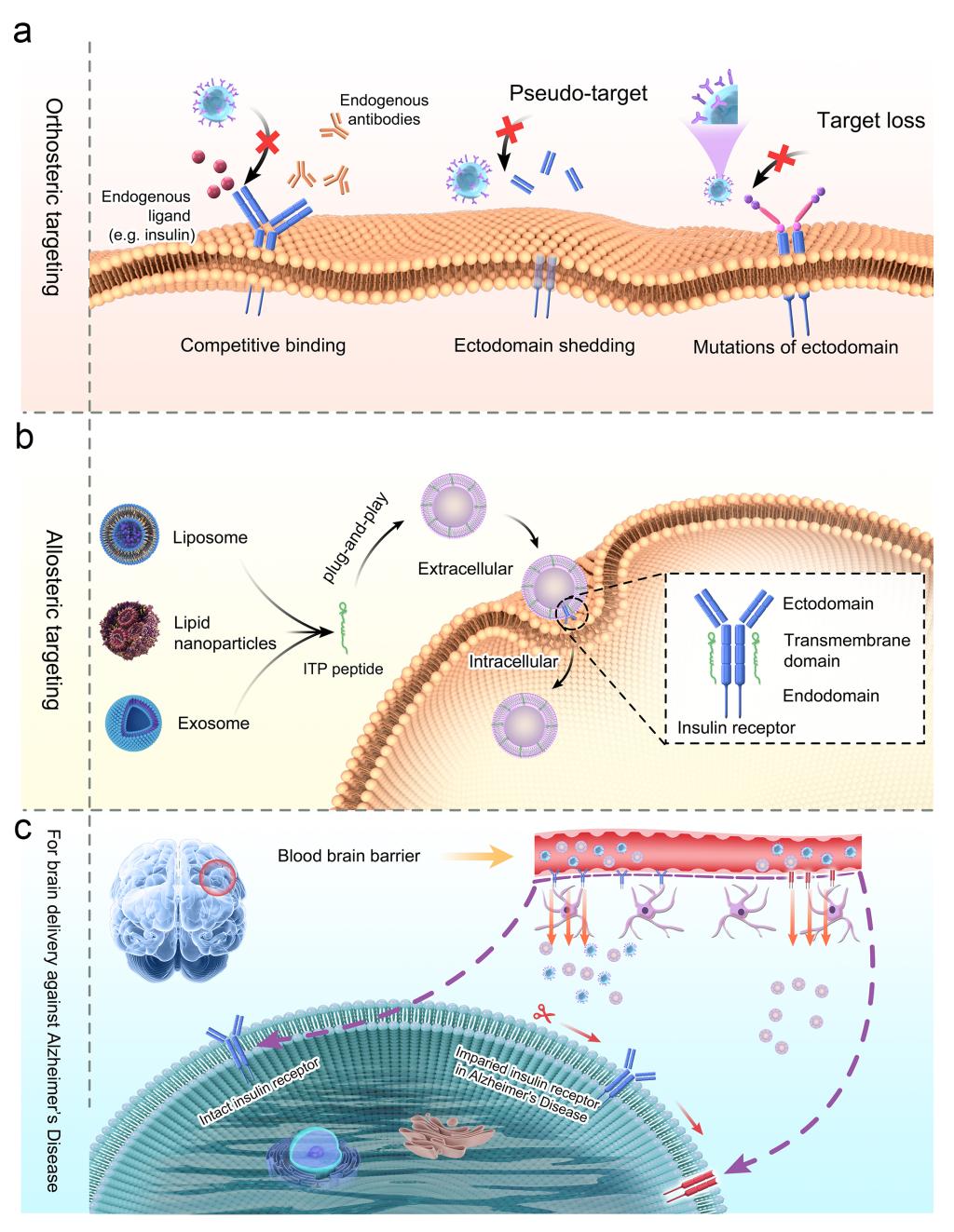 該研究工作提出了一種別構靶向藥物遞送策略,通過設計特異性結合血腦屏障上膜受體跨膜結構域的多肽配體以介導腦靶向作用。該策略以胰島素受體和整合素αv為研究靶點,通過作用于受體跨膜區而非傳統配體結合位點,有效規避了內源性配體及抗體的競爭性干擾,同時可克服因受體胞外區脫落或突變導致的偽靶或失靶的問題。此外,配體無需化學修飾即可通過“即插即用”方式自發嵌入脂質載體的磷脂層,展現出優異的可調節性和免疫相容性。總體而言,該別構靶向策略可適用于多種受體靶點及藥物載體,為腦部疾病治療提供了新的思路。
