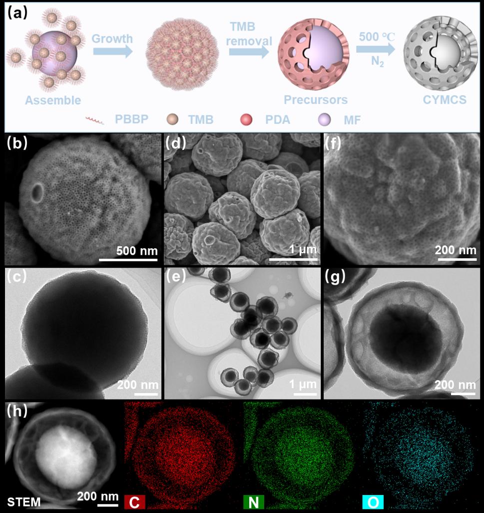 圖1.a)CYMCS制備示意圖,b,c)CYMCS前驅(qū)體的SEM和TEM圖像,d-g)CYMCS在1μm和200nm尺度上的SEM和TEM圖像,h)CYMCS的STEM圖像和EDX元素分布圖。