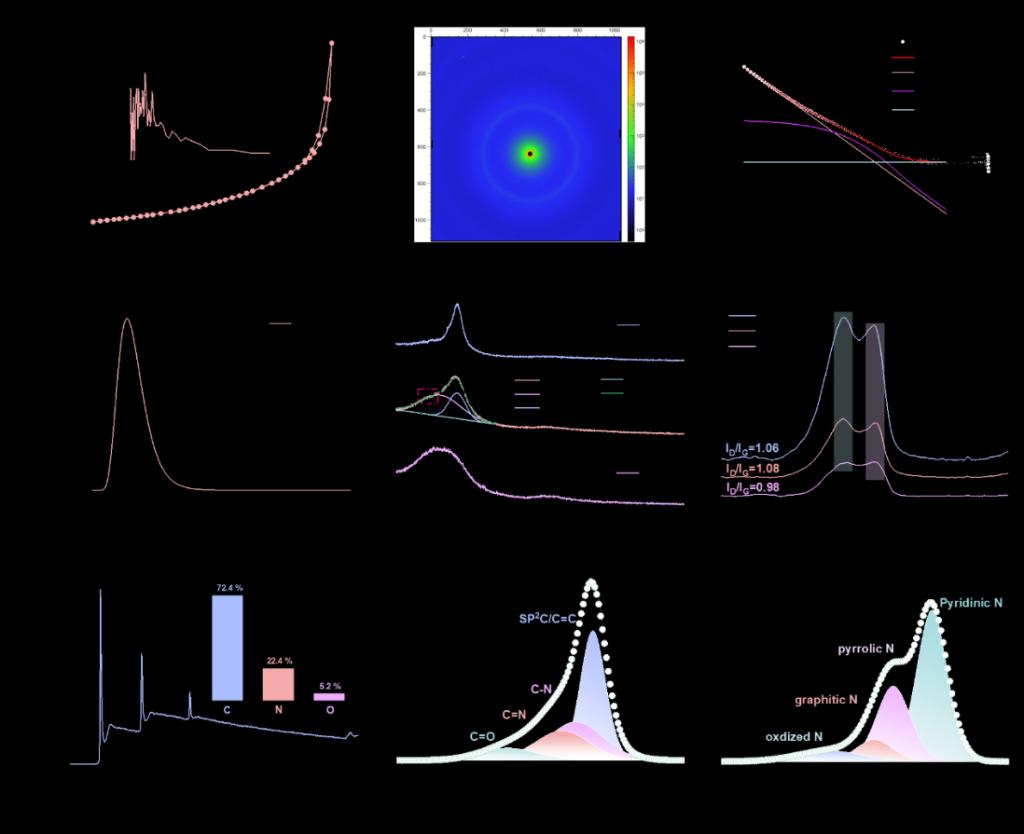 圖2.a)CYMCS和HMCS的N2解吸等溫線、插圖顯示孔徑分布,b)SAXS衍射圖,c)CYMCS的SAXS擬合圖,d)從CYMCS的SAXS擬合圖中得出的孔徑對(duì)數(shù)正態(tài)分布,e)MFC、CYMCS和HMCS的XRD圖以及CYMCS的擬合圖,f)CYMCS、HMCS和MFC的拉曼光譜,g)CYMCS的XPS全譜圖,插圖顯示元素組成分布,h)CYMCS的XPSC1s光譜,i)CYMCS的XPSN1s光譜。