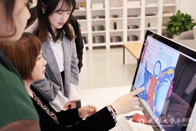 2023年8月,學生藝術實踐工作坊《“大美蜀錦”非遺傳承創新工作坊》在四川省第十屆大學生藝術展演活動中獲一等獎。備展時,馬麗娃老師正在泰國學習,聽聞展演不符合場地要求,便在線上進行遠程指導,兩方合力克難,連夜完成了修改。“老師同學們都特別給力,才拿到了這么好的成績?!?/p>
