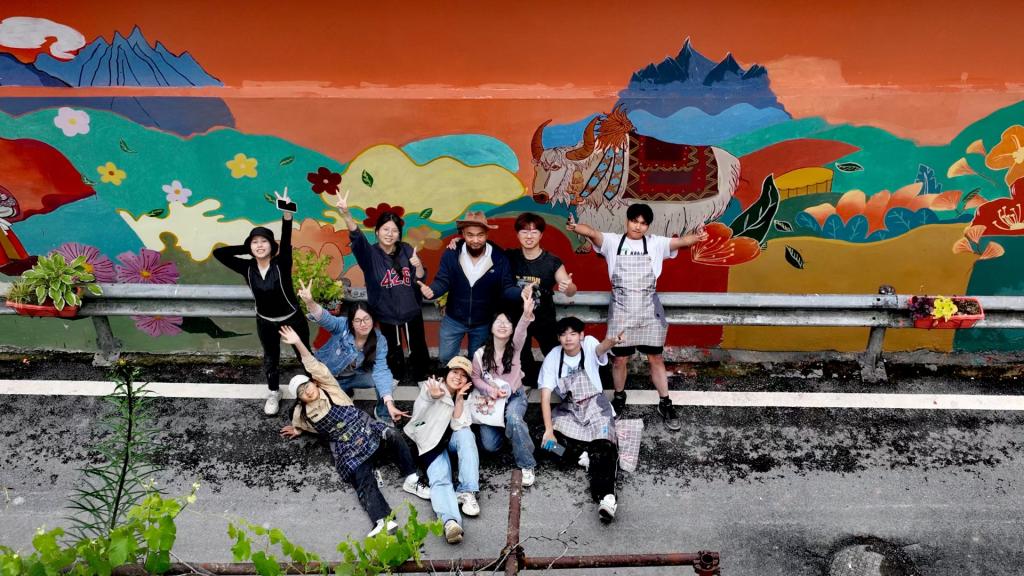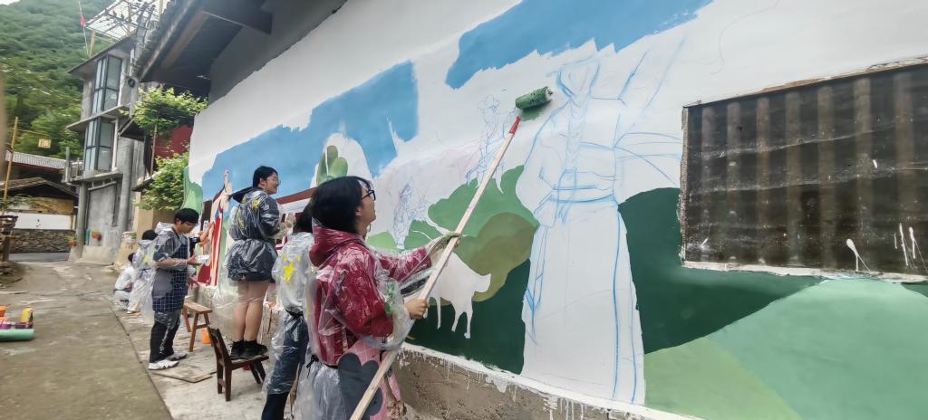 但新的挑戰(zhàn)接踵而至——淡季客源斷崖式下跌。2024年4月在姚庚的努力及學校的支持下,成都大學美術與設計學院羅徠教授率隊考察,與當?shù)睾灱s共建實踐教育基地,隨后組織34名師生到村開展為期四天的墻繪創(chuàng)作,遇上下雨時,師生們便穿著雨衣打著手電進行繪畫,最終成功將167平米的素白民房外墻變?yōu)榱怂囆g景觀,吸引游客“打卡”,進一步打開了客源群體。“有了學校的幫助,再大的困難都不是事。”姚庚在幫扶工作中常常感慨。